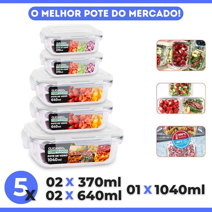 Kit 5 Potes de Vidro Hermético Geladeira Marmita Tampa 370ml/640ml/1040ml