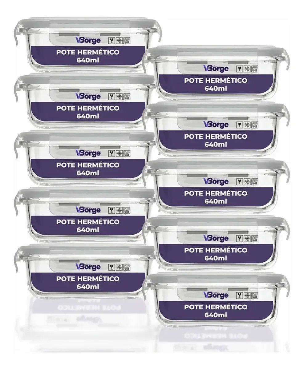 Kit 10 Marmitas De Vidro 640ml Potes Com Tampa Hermética 4 Travas