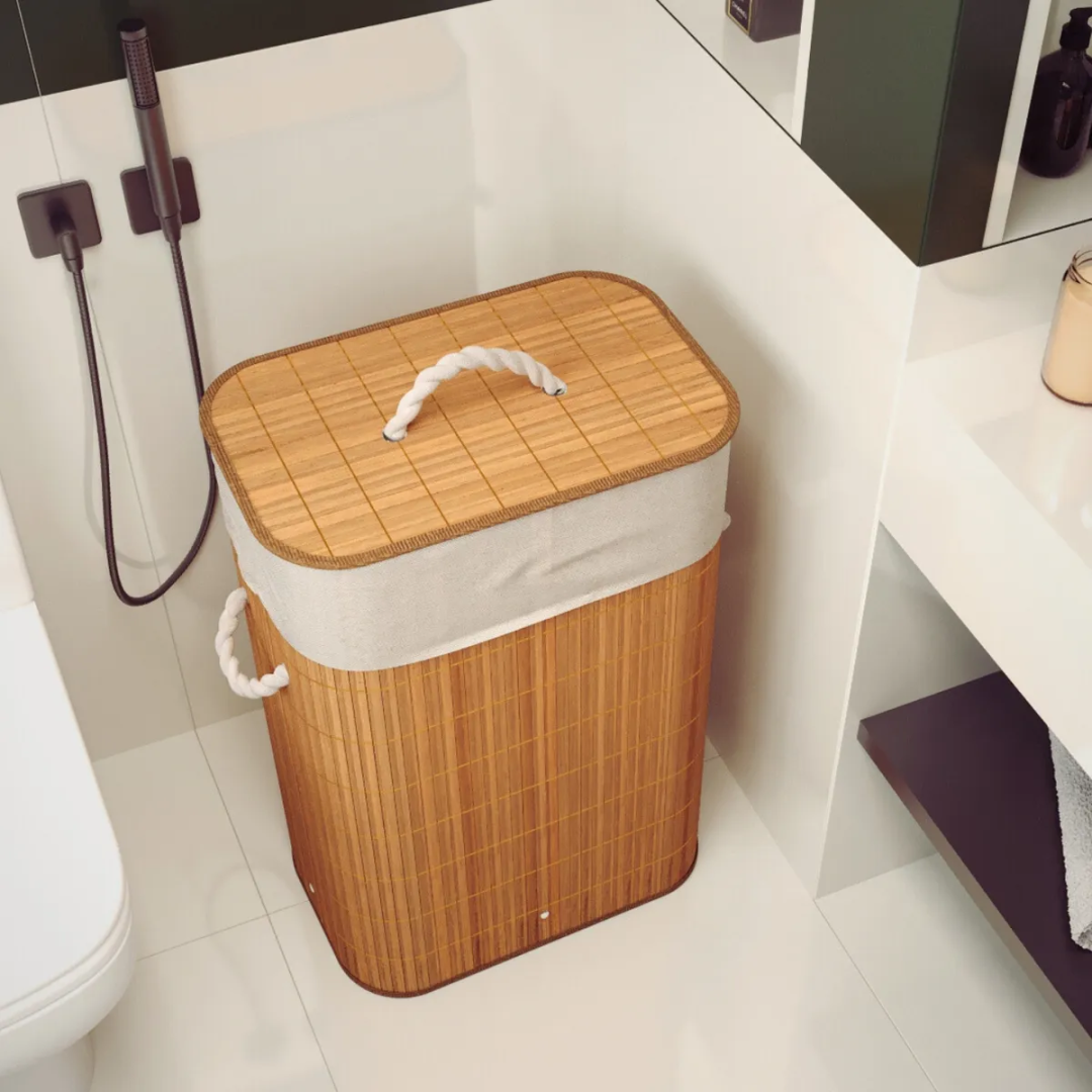 Cesto De Roupa Suja Bambu 72 Litros Dobravel Forro Antimofo