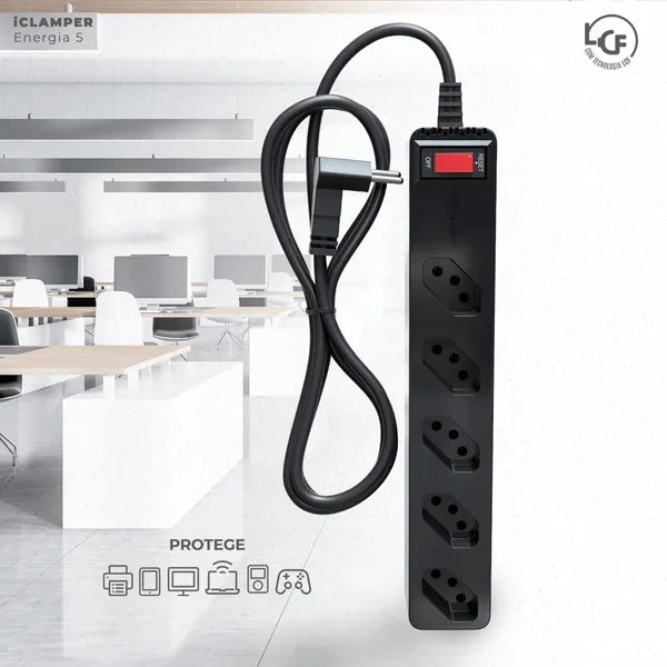 Filtro de Linha com Protetor de Surto DPS iClamper Energia 5 Tomadas 3 Pinos 10 Amperes com Tecnologia LCF Anti Raio Clamper Cor Preto