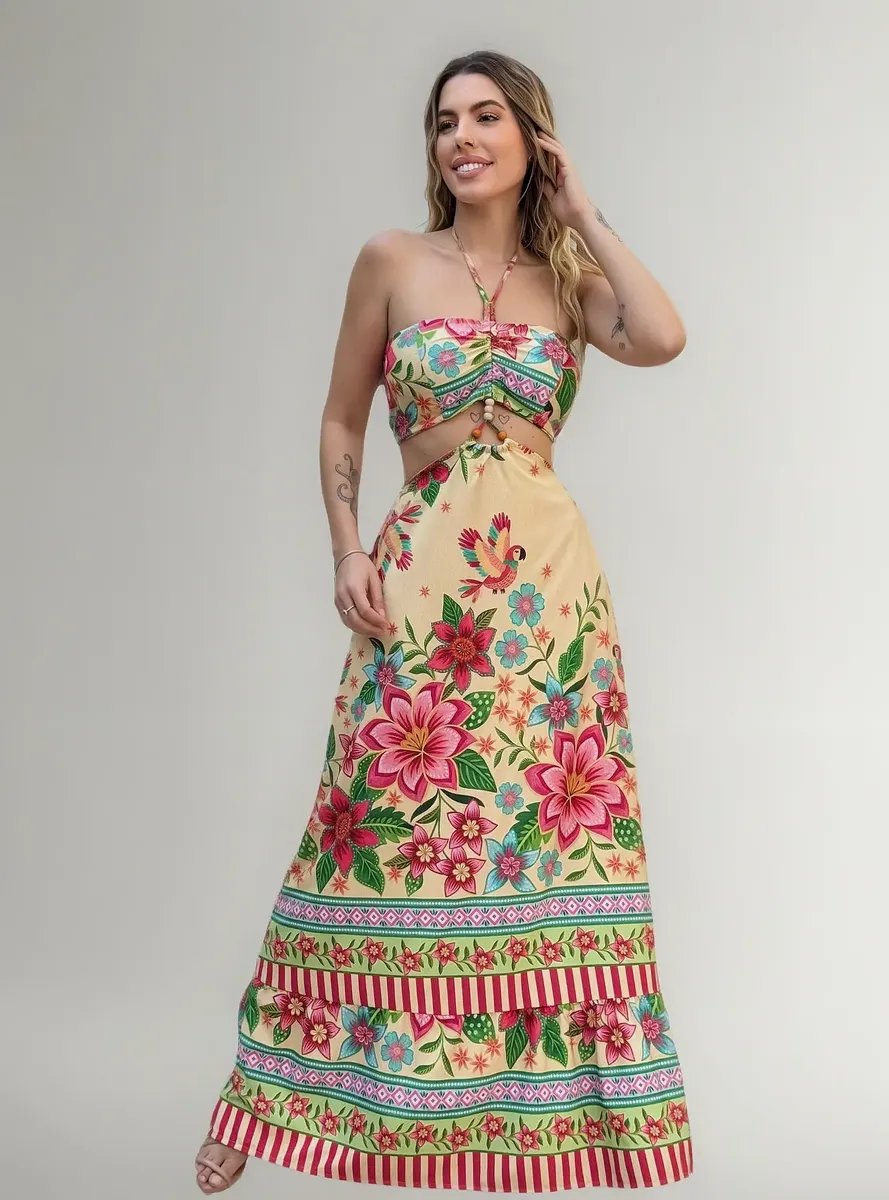 Vestido Longo Floral Verão Praia Recorte Elegante -3014